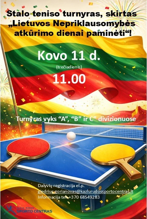 Kazlų Rūdos savivaldybės stalo teniso turnyras vyks 2026.03.11 dieną (trečiadienį). Pradžia – 11 val.