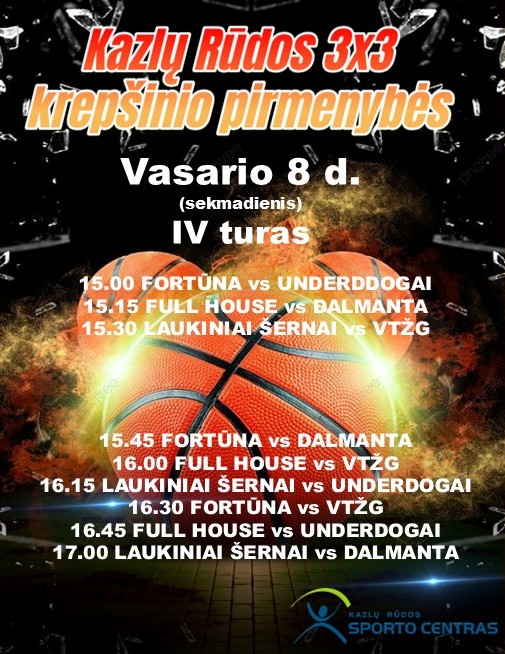 Kazlų Rūdos 3×3 krepšinio pirmenybės. IV turas + Pridėti į Google kalendorių + iCal / Outlook kalendorius Data 2026-02-08 Pasibaigęs Laikas 15:00 - 17:15 Pasidalinti renginiu