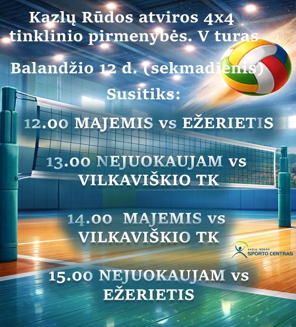 Kazlų Rūdos atviros 4×4 tinklinio pirmenybės. V turas + Pridėti į Google kalendorių + iCal / Outlook kalendorius 00 dienos 00 valandos 00 minutės 00 sekundės Data 2026-04-12 Laikas 12:00 - 16:00 Pasidalinti renginiu