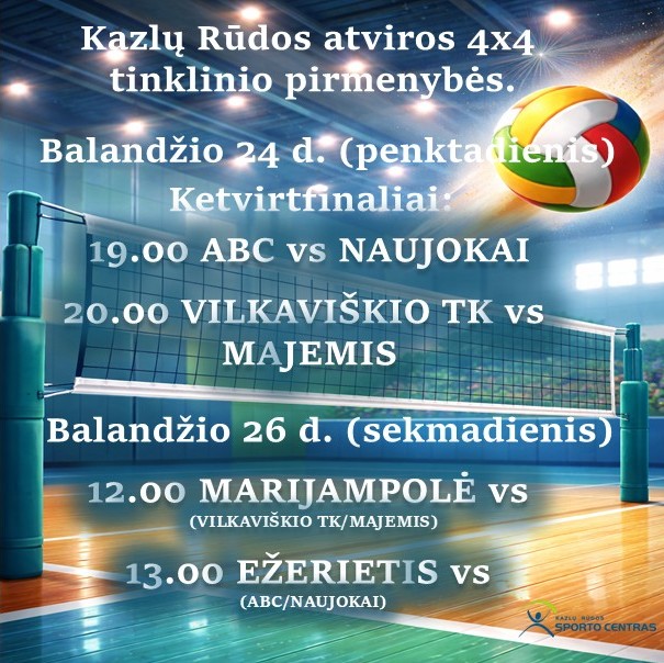 Kazlų Rūdos atvirų 4×4 tinklinio pirmenybių ketvirtfinaliai, pusfinaliai! + Pridėti į Google kalendorių + iCal / Outlook kalendorius 00 dienos 00 valandos 00 minutės 00 sekundės Data 2026-04-24 Laikas 19:00 - 22:00 Pasidalinti renginiu