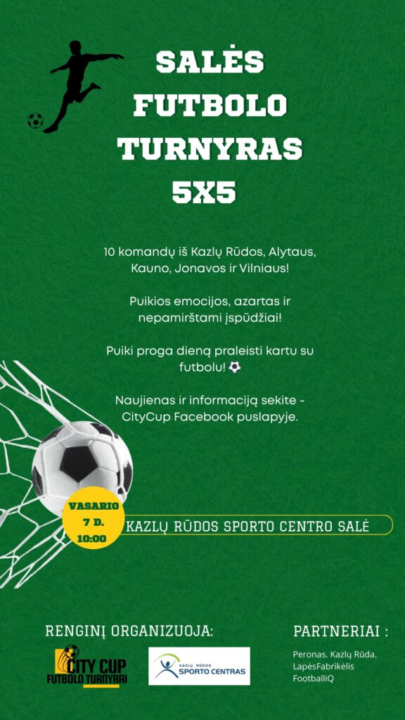 Salės futbolo turnyras „City Cup‘ 2026“ vyks vasario 7 d. (šeštadienis) Kazlų Rūdos sporto centro salėje, esančioje S.Daukanto g.18. Pradžia 10.00.